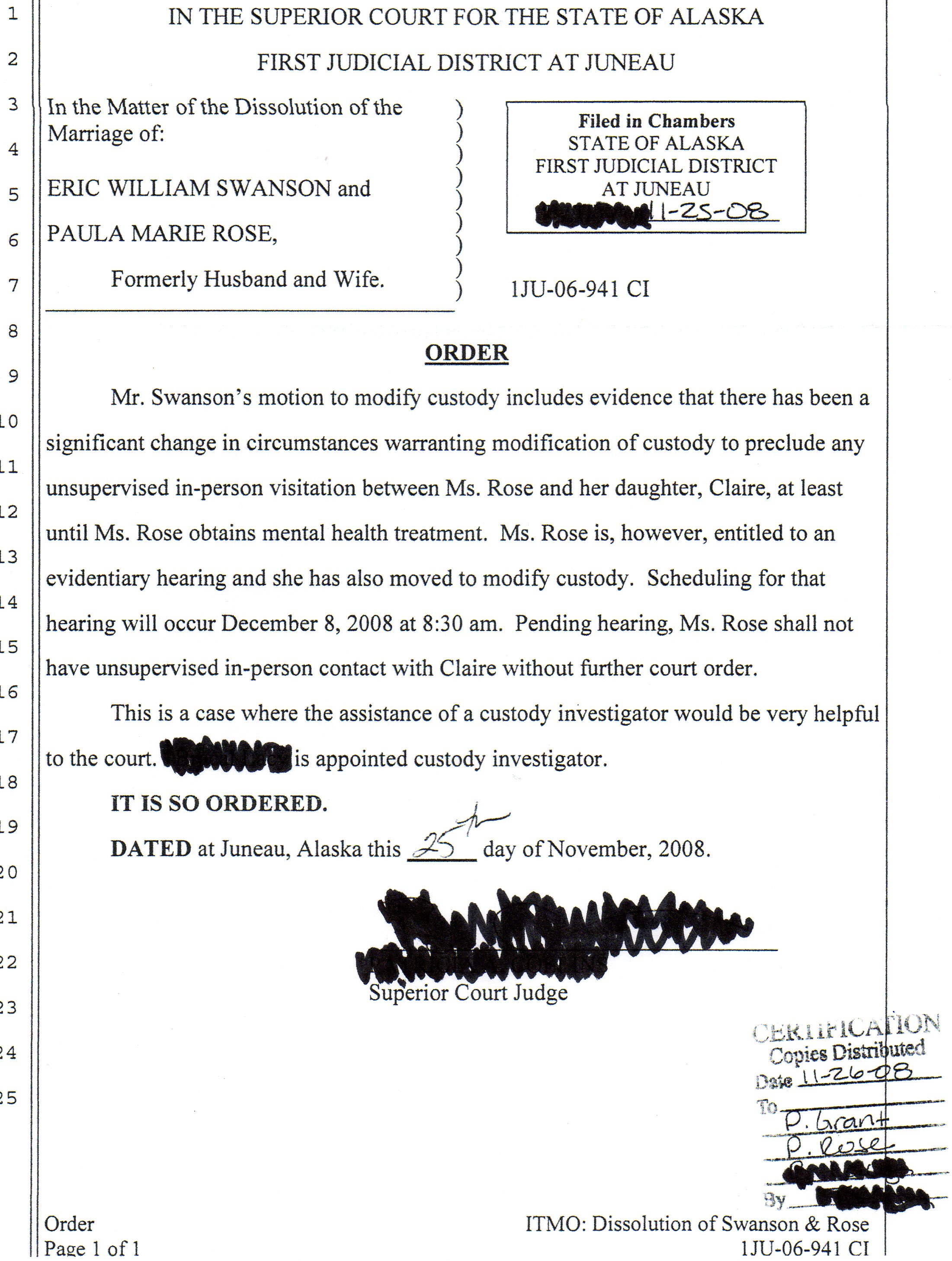 Below is an Order which I received on December 1, 2008. I have marked out the names of the court staff, the appointed child custody investigator, and the Judge, as I still have an elevated level of respect and appreciation for the legal system, and legal processes, and some staff.
