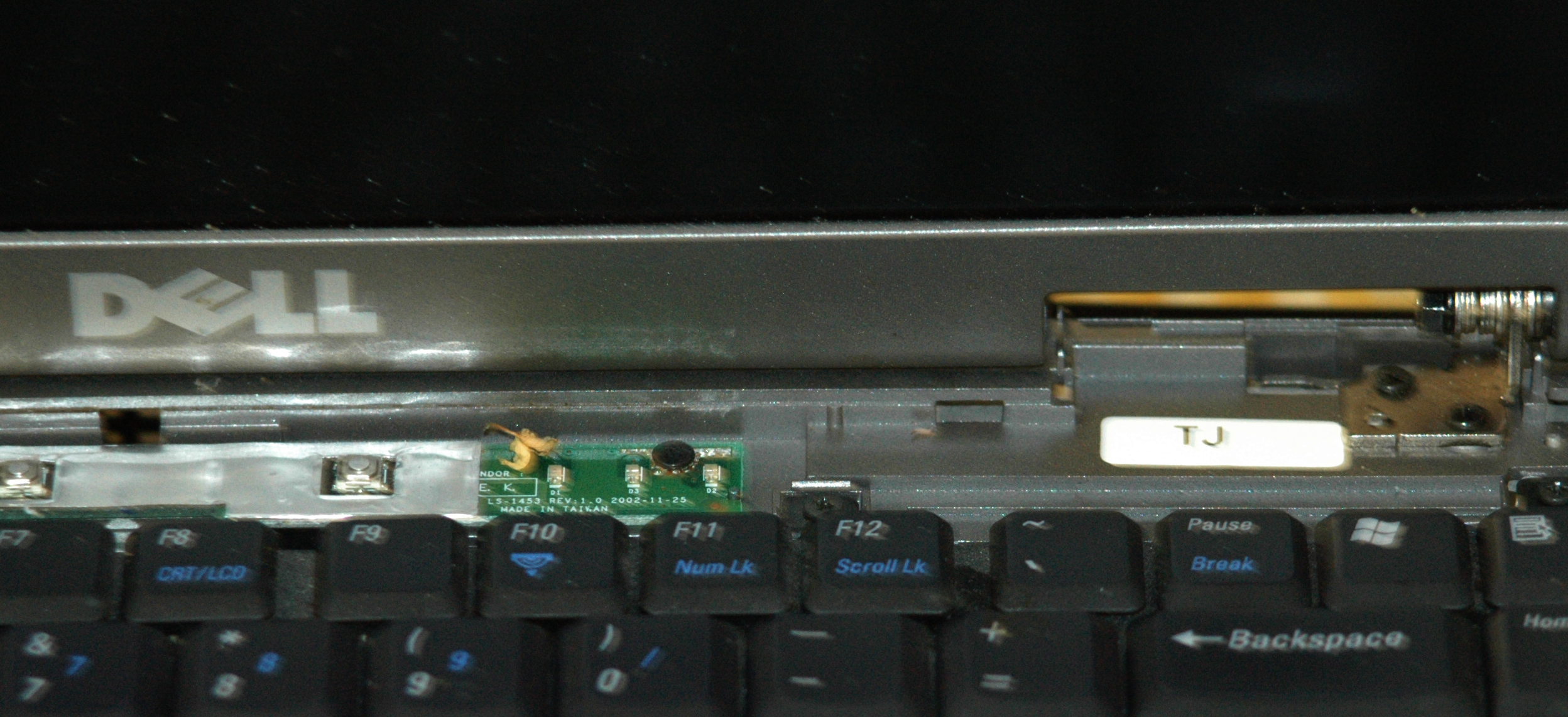 Arriving on Halloween night 2007, for what became a 3 week visit to Mom and Dad's house, I took apart my 3 years old Dell laptop. As I pulled off the frame around the keyboard, a plain, white sticker appeared underneath, and just above the function keys with the initials "TJ." Click here for photo. He asked it I were going to throw the laptop away, but seemed surprised that I wanted to keep it. I gave him the power cord, after having a peek inside the power pack. I've had countless problems with all my of laptops, 2 Dell, and 1 Toshiba. I was