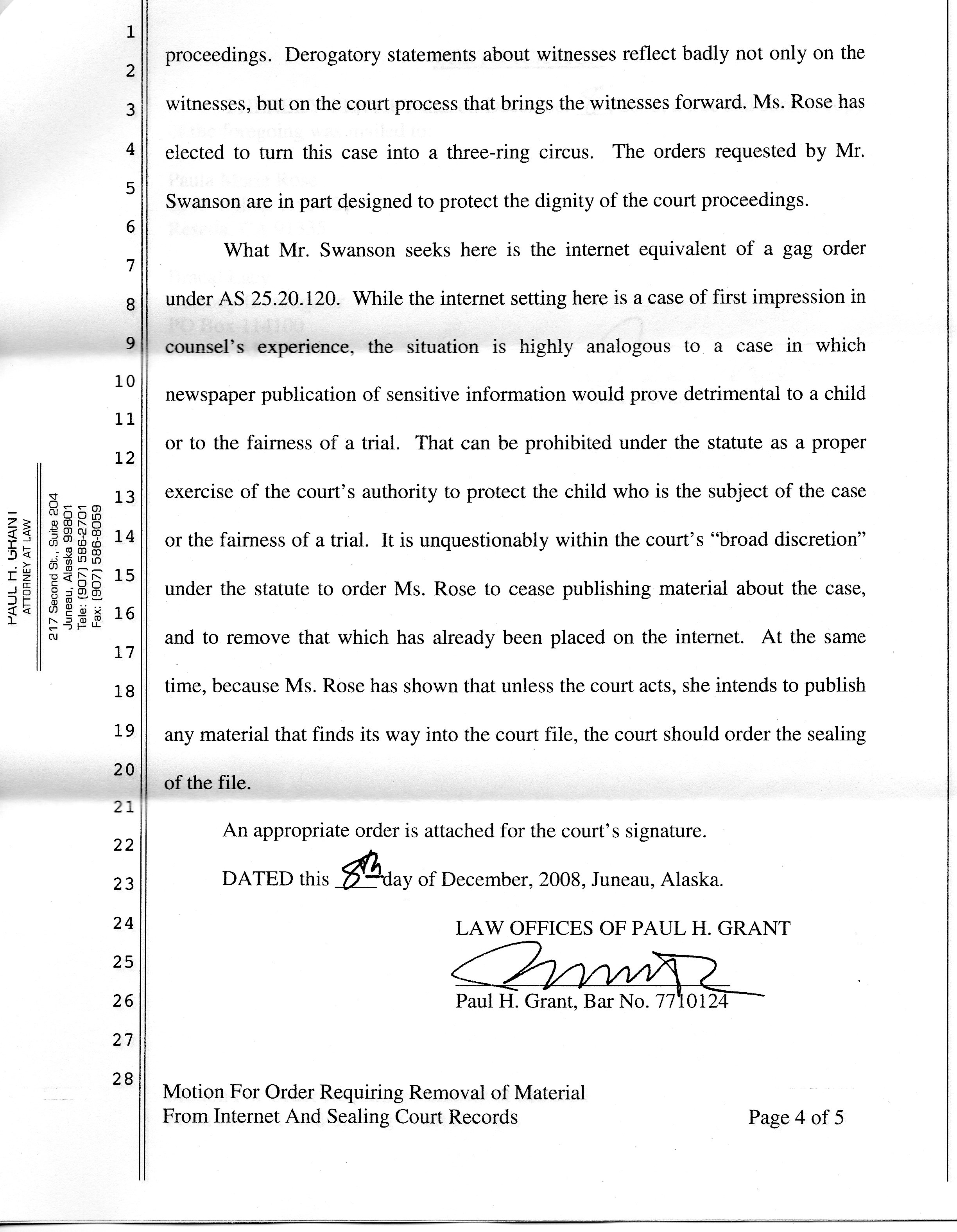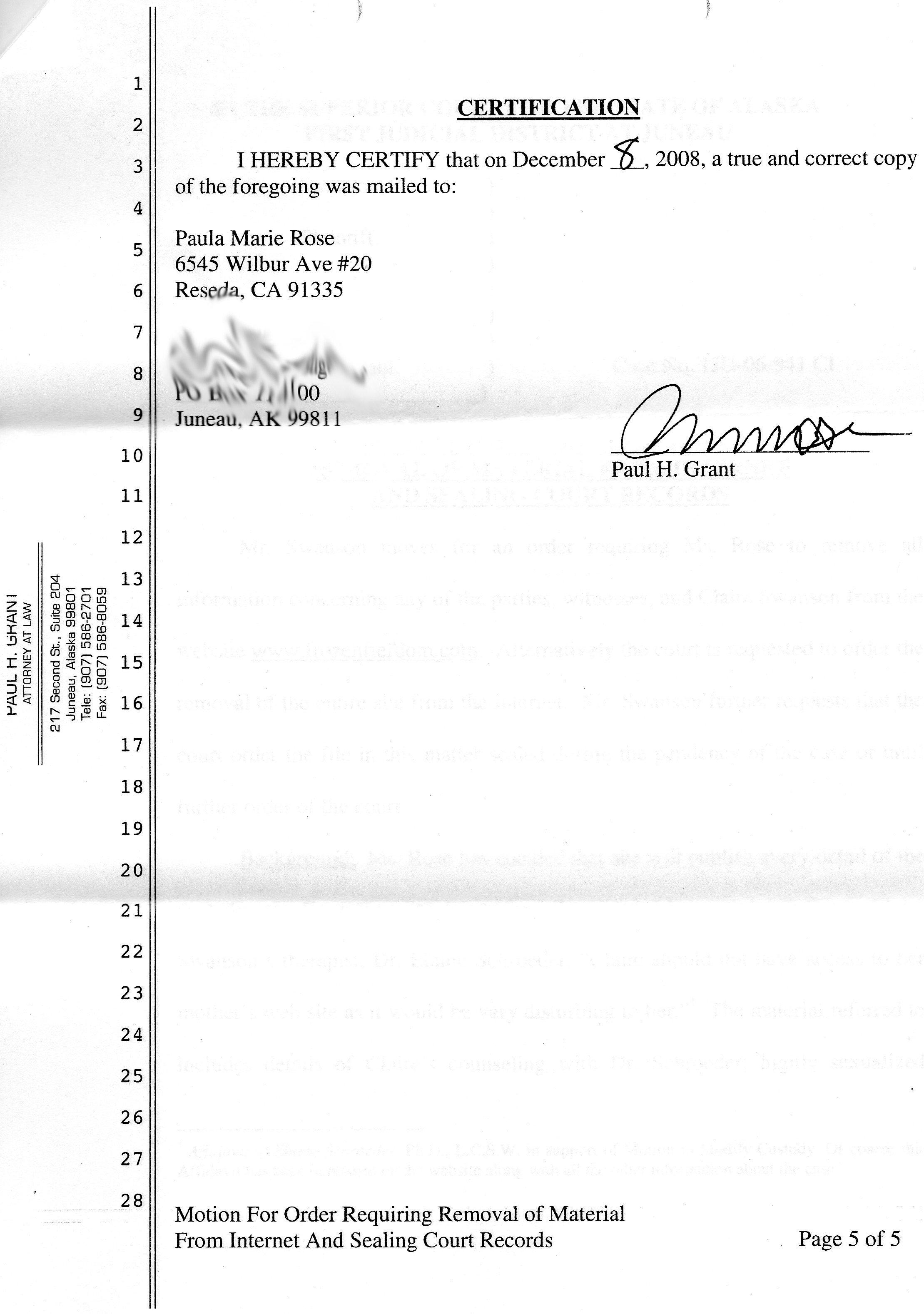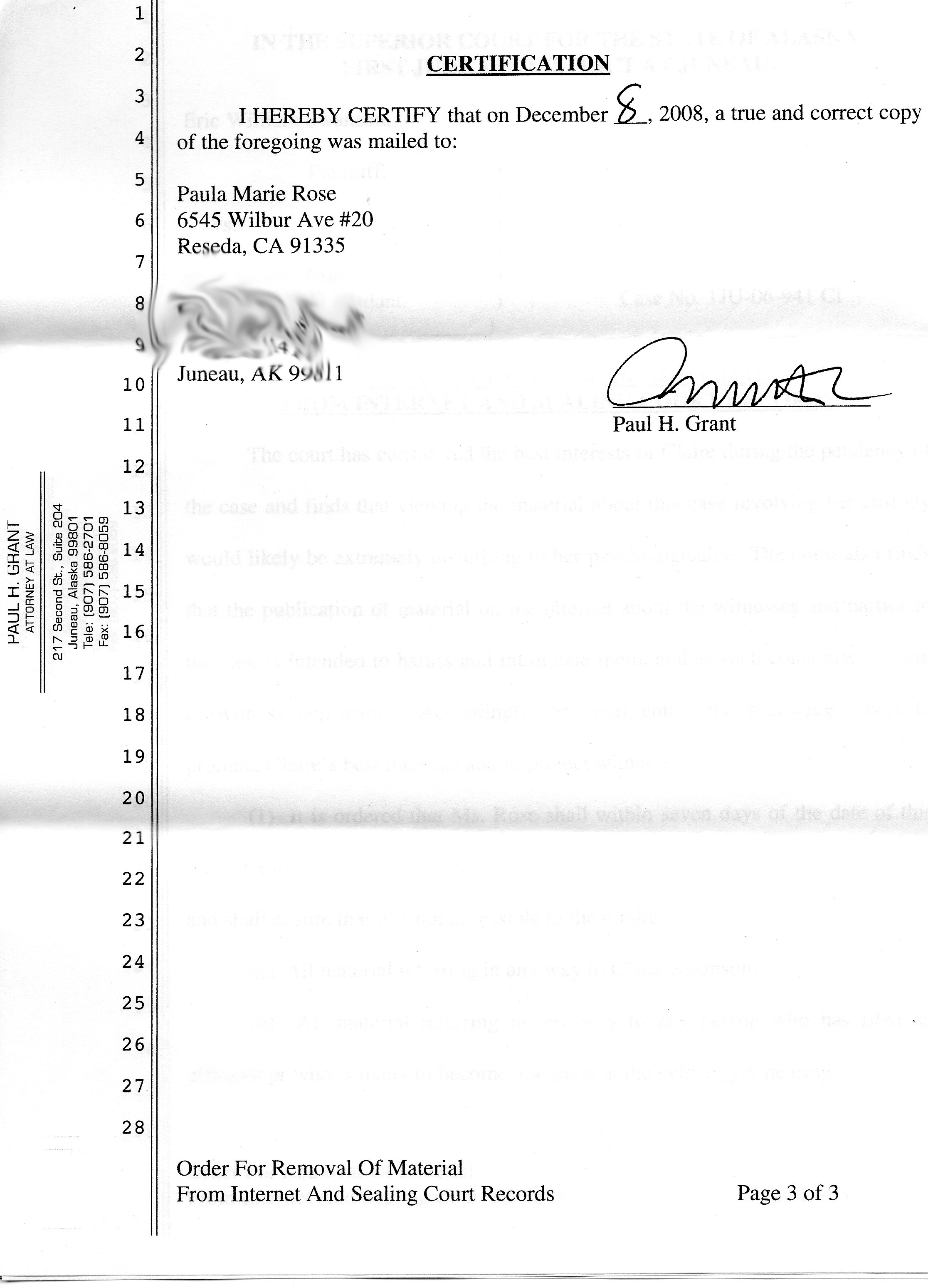 I have a busy day and won't have time to do a full review and comment on these pages until later. I have smudged out my daughter's last name, and that of the Child Custody Investigator. It's pretty much the same recycled information and objections as Mr. Grant has previously submitted, which he also has highly dramatized, but he has tossed in a few statues for the Judge to consider. Statues or not, the Truth is what is important for everyone to consider, and my publishing all sides is very fair and balanced. The Judge may have the authority to order some parts be removed; I'll have to check into that. If anyone has any Supreme Court decisions on Website Cases, please send it to me at paula@frozenfiefdom.com
