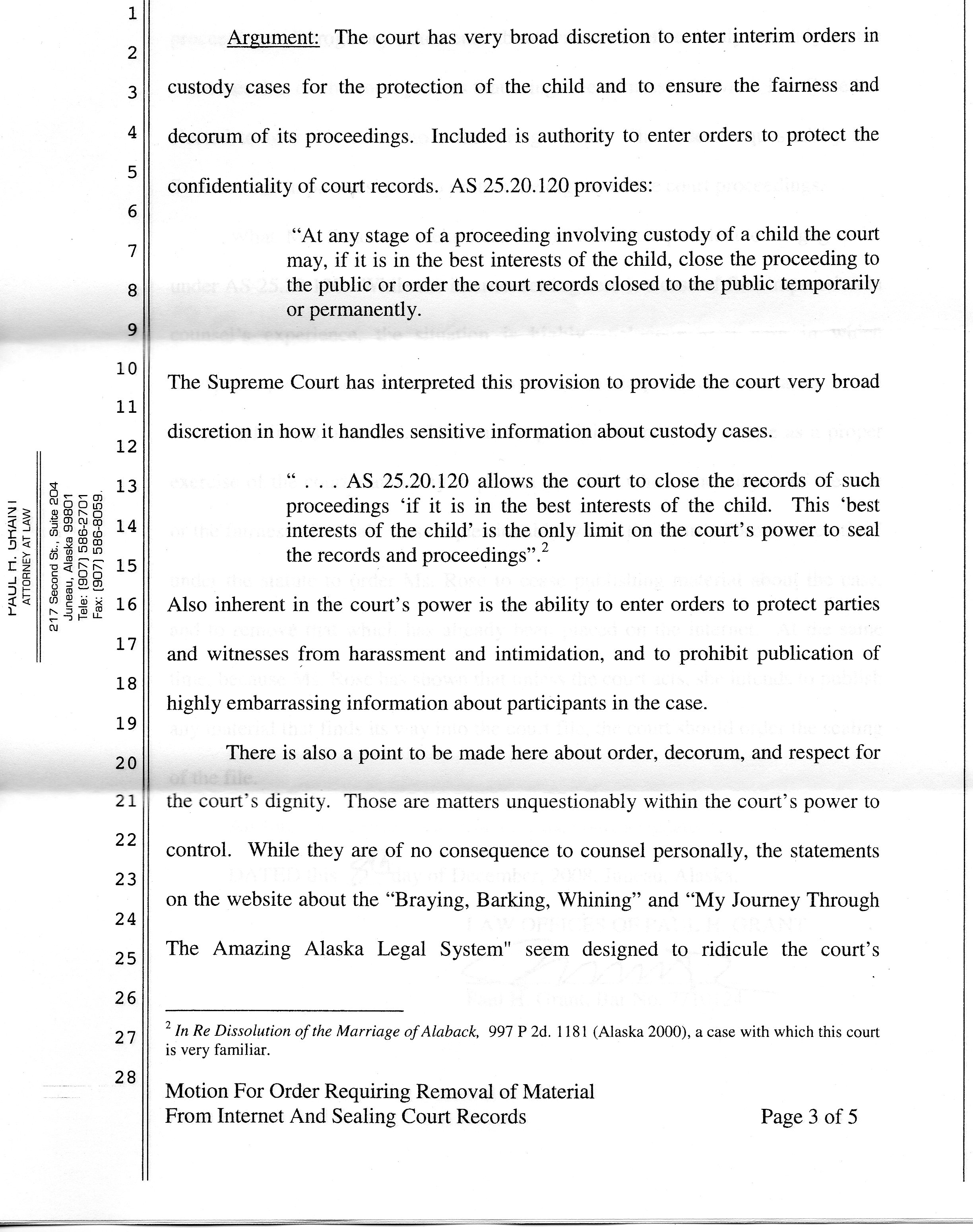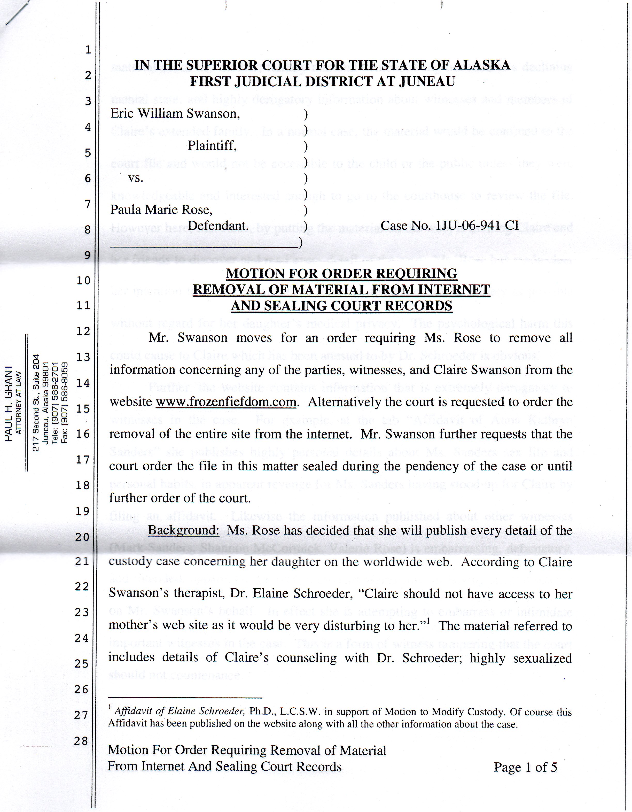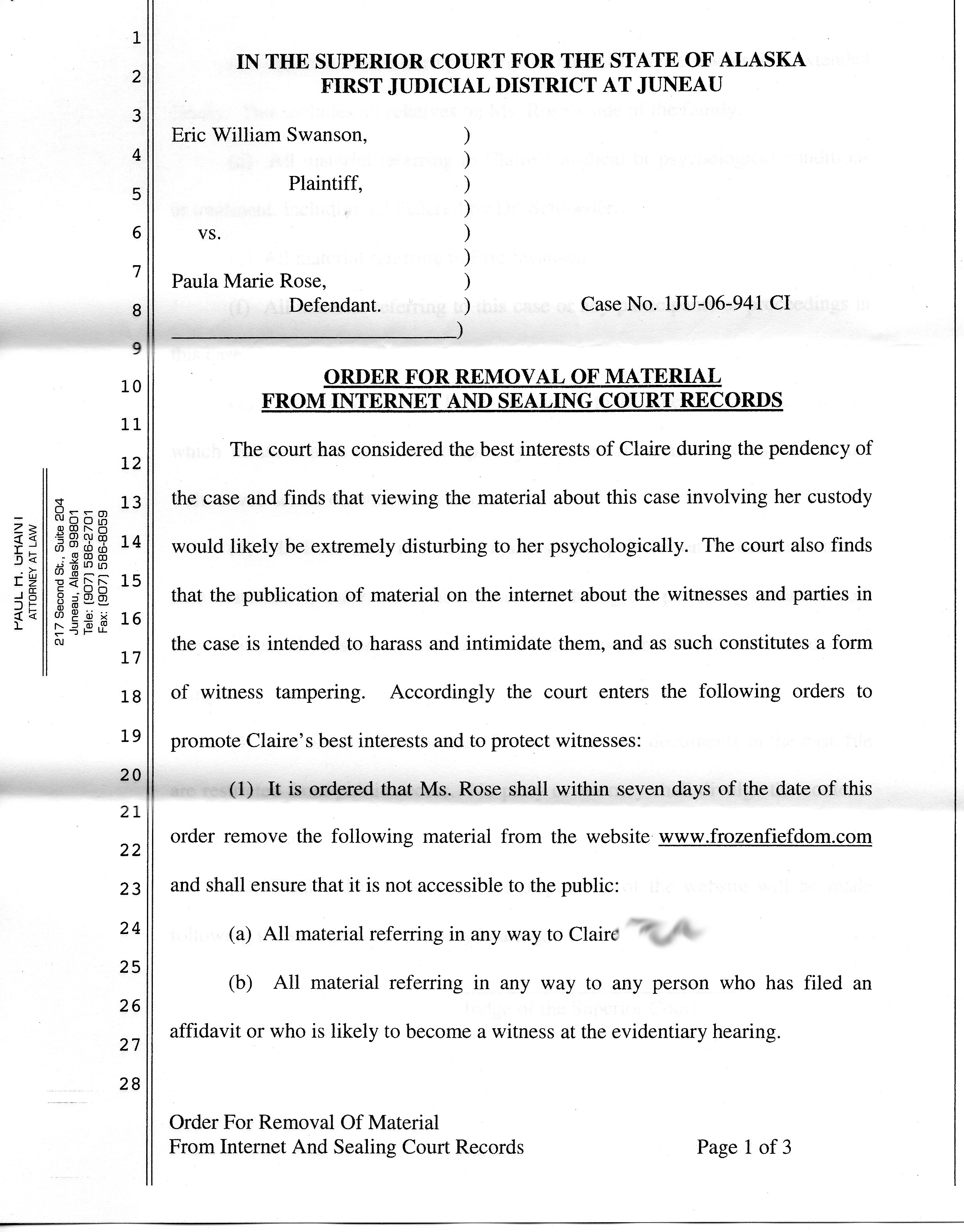 I have a busy day and won't have time to do a full review and comment on these pages until later. I have smudged out my daughter's last name, and that of the Child Custody Investigator. It's pretty much the same recycled information and objections as Mr. Grant has previously submitted, which he also has highly dramatized, but he has tossed in a few statues for the Judge to consider. Statues or not, the Truth is what is important for everyone to consider, and my publishing all sides is very fair and balanced. The Judge may have the authority to order some parts be removed; I'll have to check into that. If anyone has any Supreme Court decisions on Website Cases, please send it to me at paula@frozenfiefdom.com