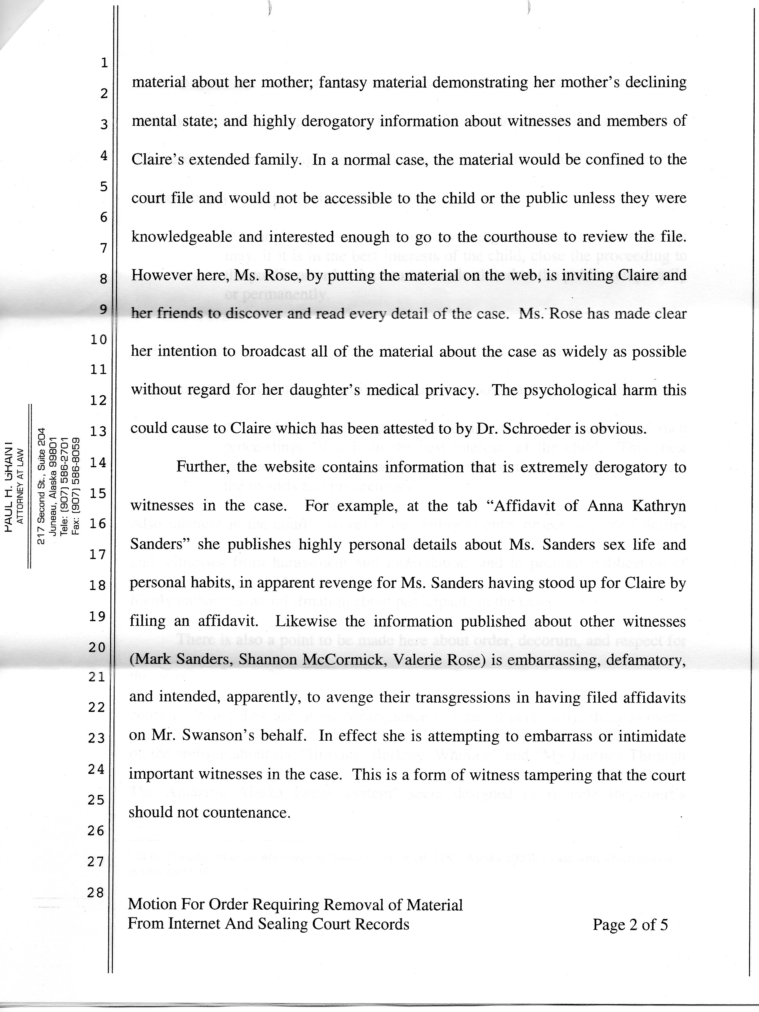 Again, he specifically mentions Dr. Elaine Schroeder's Affidavit, and refers to her as my daughter Claire's "therapist". How strange that Dr. Elaine Schroeder has yet to produce any proof that she has actually seen my daughter in a professional capacity. He also states below that I have published highly personal details about the sex life and personal habits of Anna Kathryn Sanders. I provided a very brief and factual overview of my sister, Anna, and she was very proud to consider herself a Lesbian for a few years of her life. Any other statements I have made about others he mentions are also true and factual; even if they don't like the truth being told. I have graciously left out many stunning facts about many, as a courtesy to spouses, or others who may be associated with those folks listed in my Autobiography. He states that my sharing my side of the story to their comments and Affidavits is "witness tampering". The facts, emails, and other statements I have provided show proof that some of those witness statements and affidavits contain false material or lies, which need to be addressed. I was unable to find an Alaska attorney to represent me, and I have chosen to use this website to represent my side of the story.