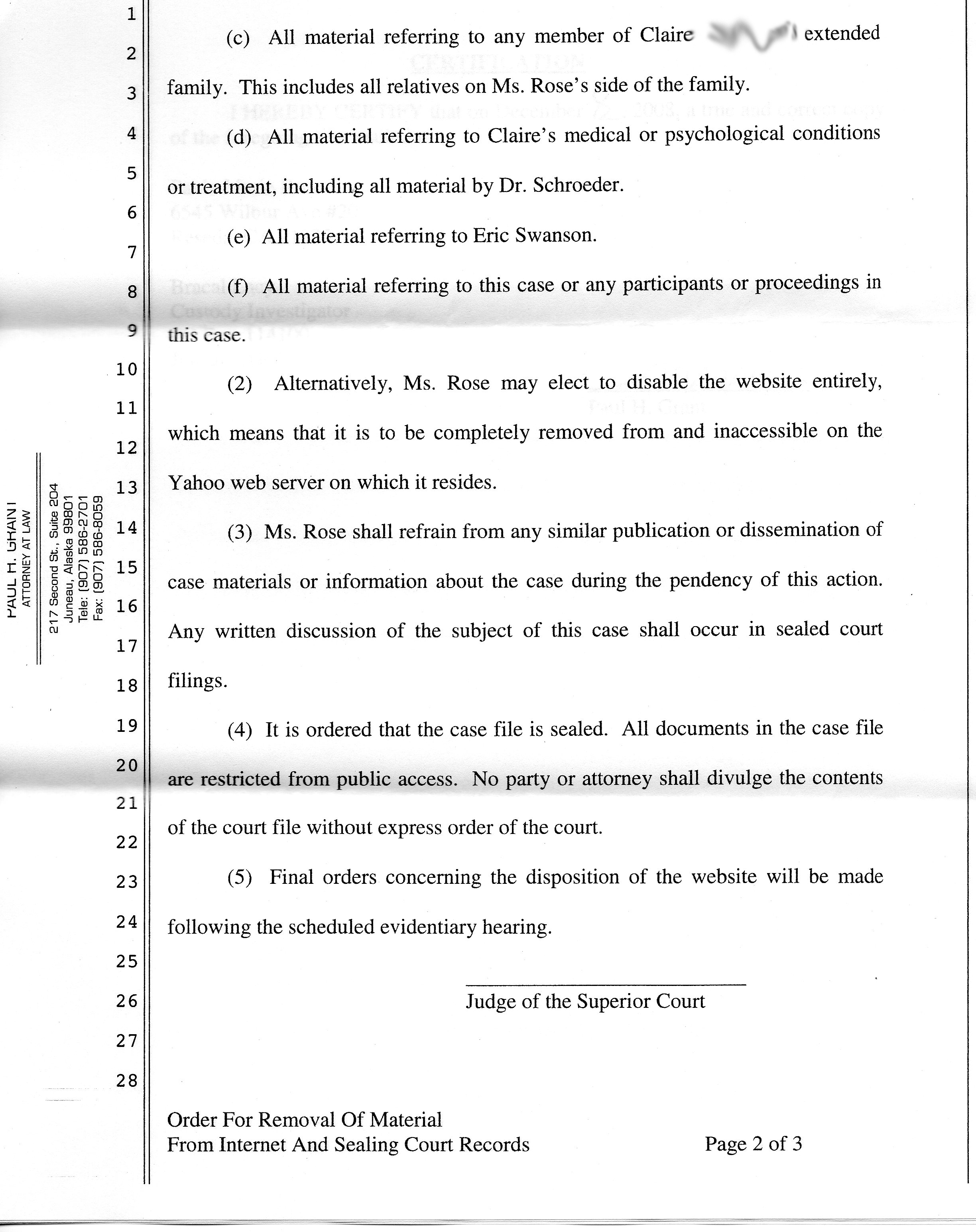 Mr. Grant continues his objections and has submitted a proposed Order for the Judge to sign. To summarize his words, he doesn't want anything about anyone connected to me, or this case, to be heard or read online, and is insisting it be removed. He further adds that all those materials exchanged with, or addressed to others be removed from this website. He also states that I might choose to disable this site completely. Nope, not a chance.