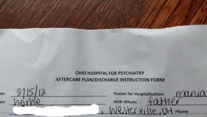He even included photos, and a partial copy of the "release" form from the MH facility. The home address is an actual address, so I will smudge it out of the document for posting, as I don't know who lives at that address, and doubt much of what this person says.
