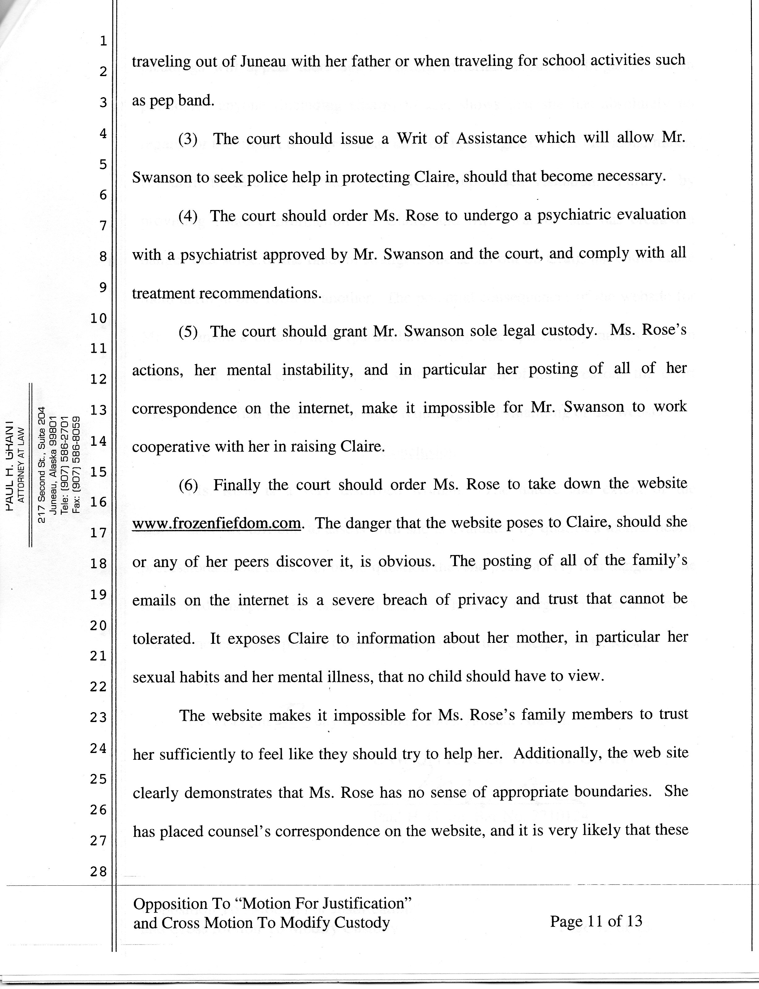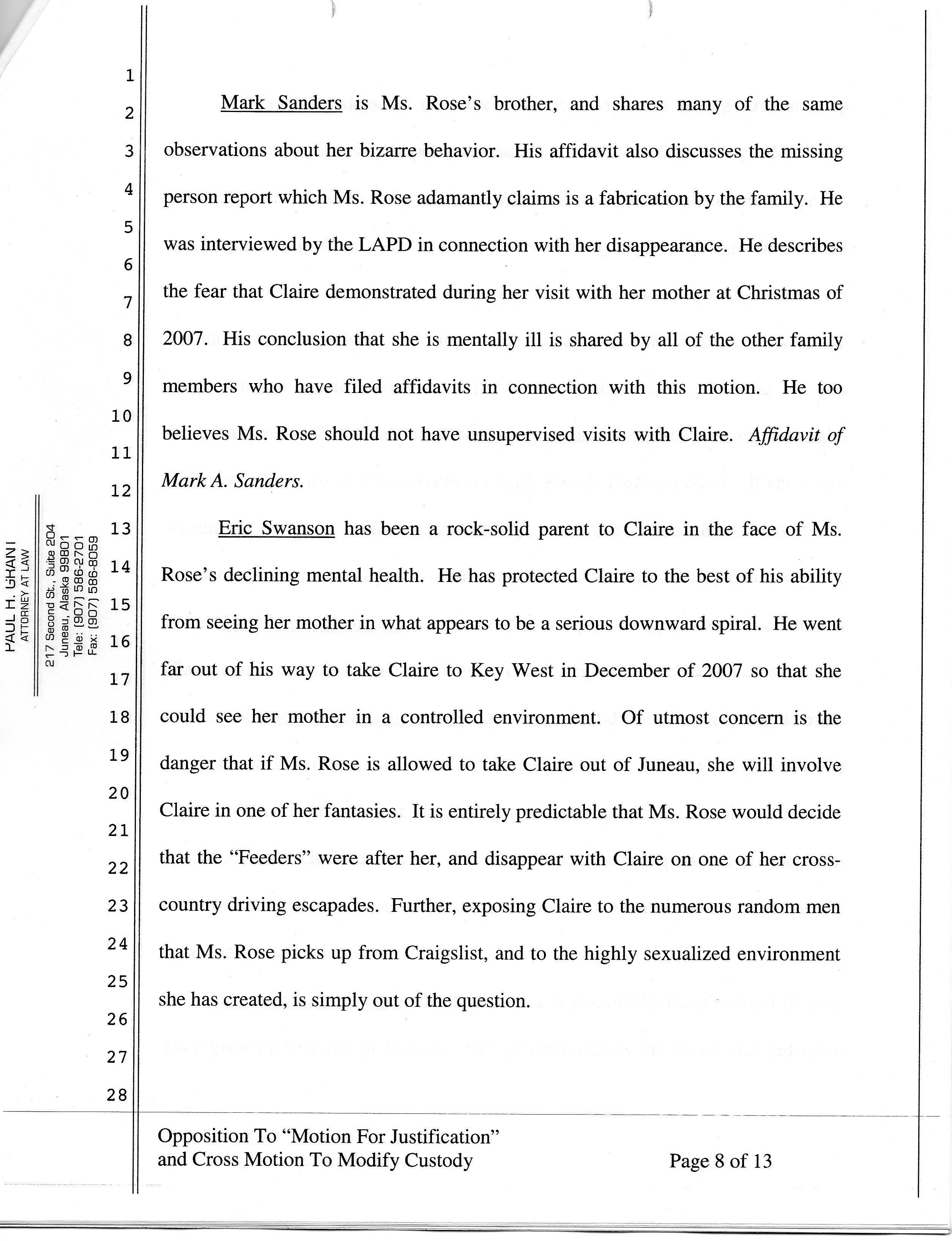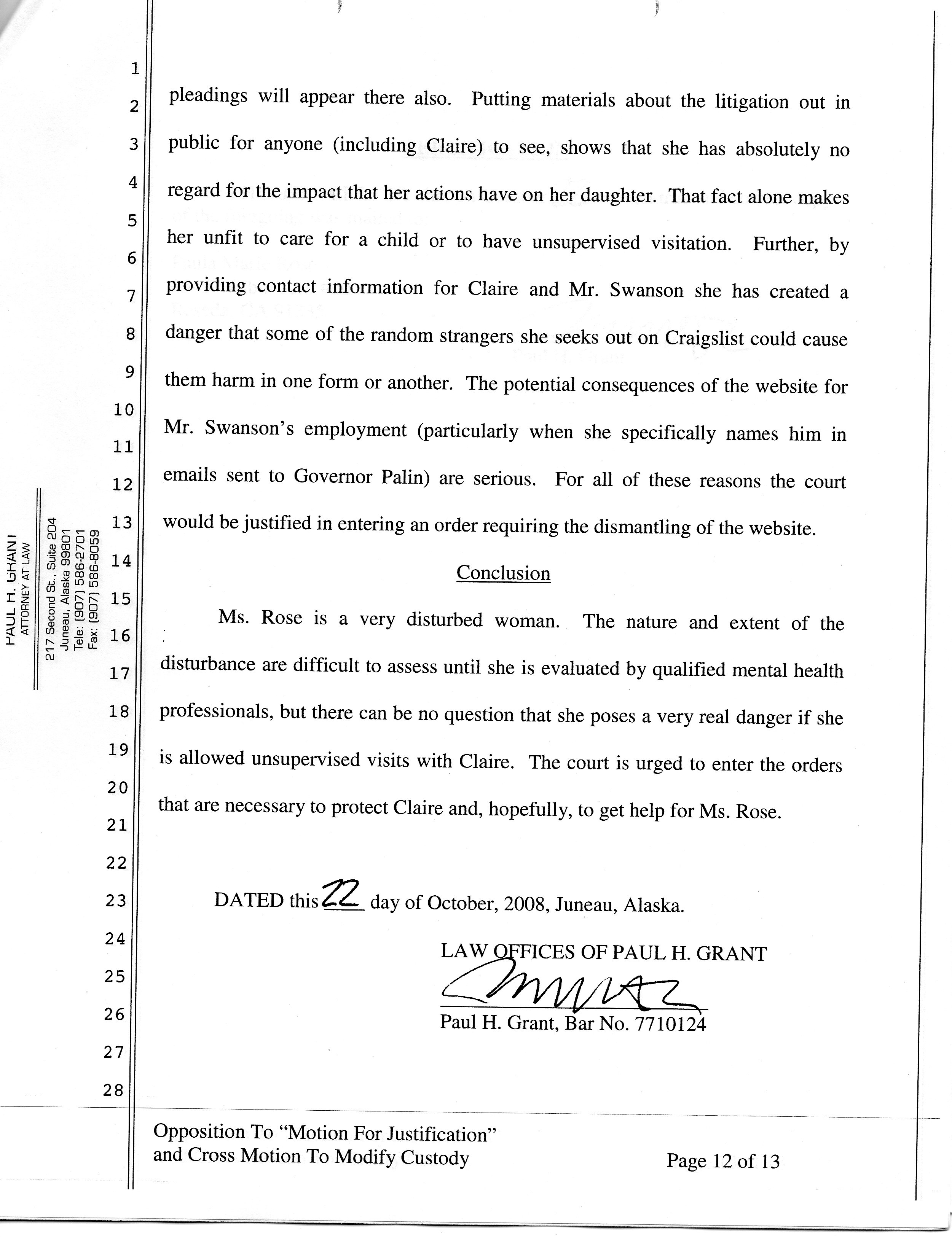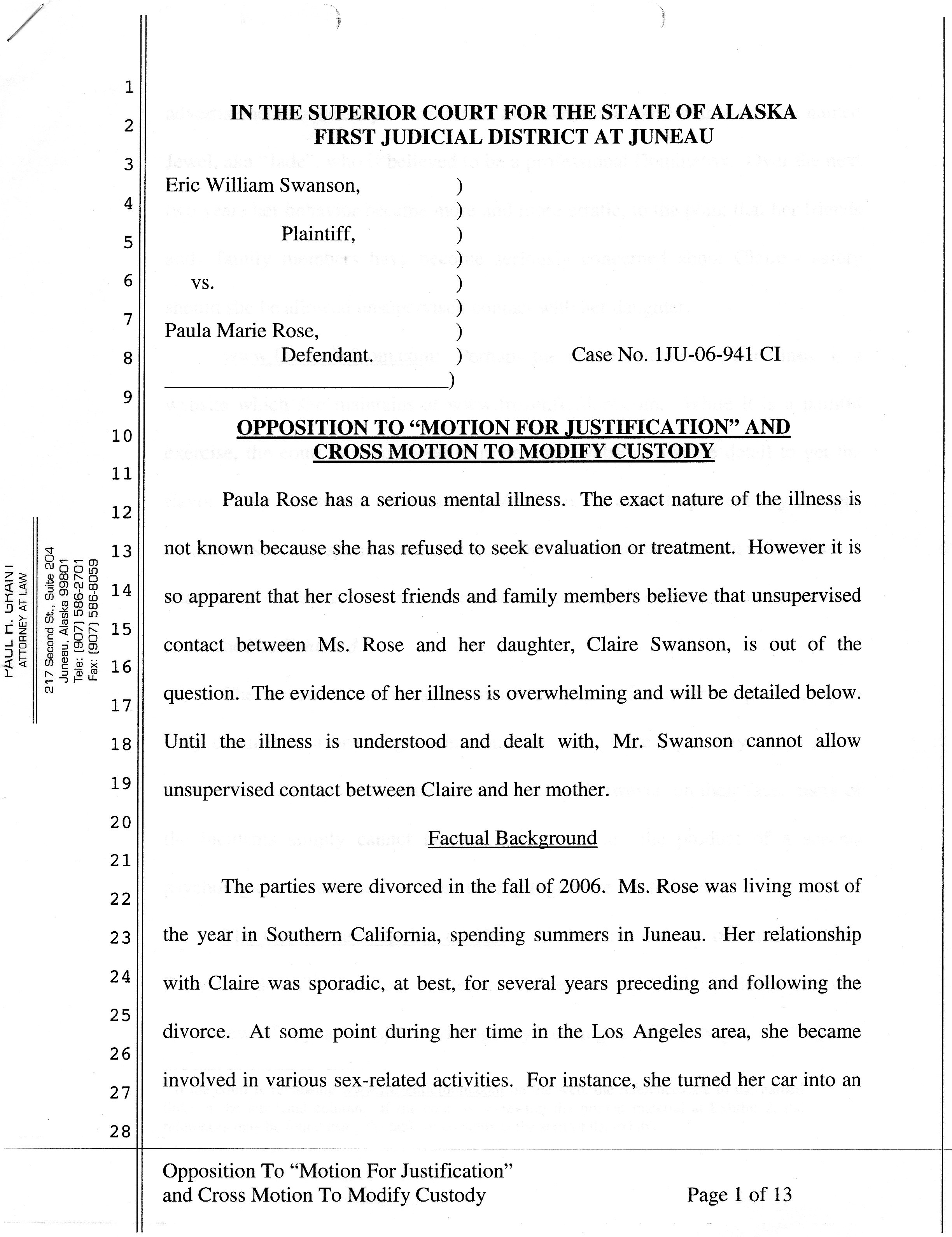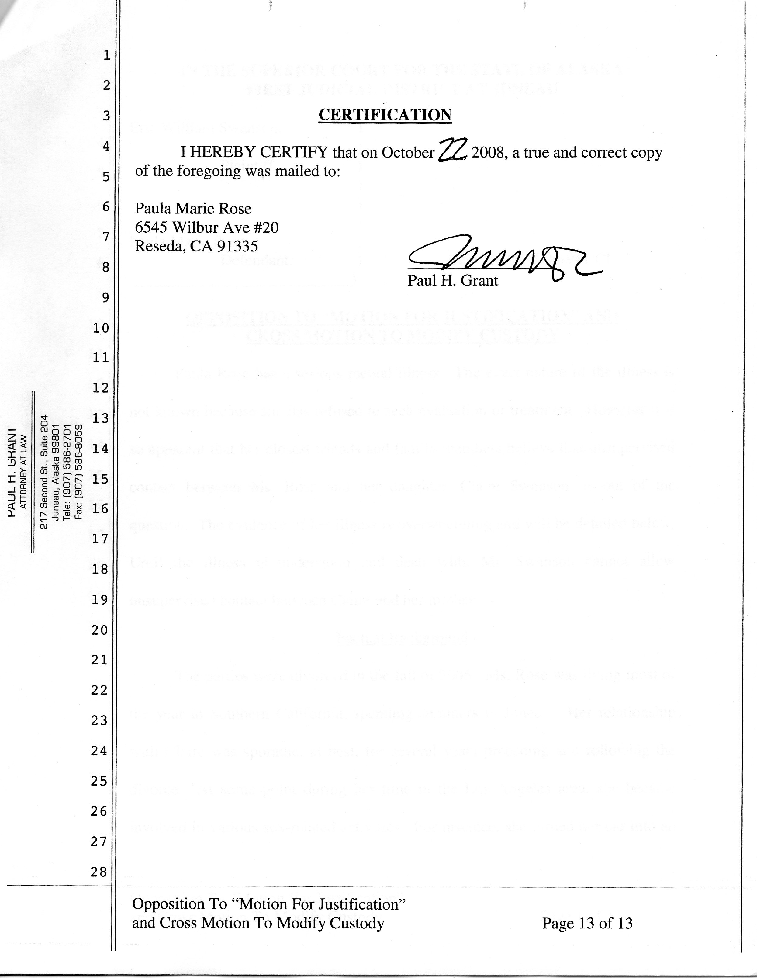 THE OPPOSITION TO "MOTION FOR JUSTIFICATION' AND "CROSS MOTION TO MODIFY CUSTODY" BY MR. PAUL H. GRANT, ATTORNEY AT LAW